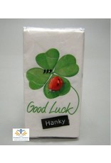 Vrolijk pakje zakdoeken met een klaver vier en lieveheersbeestje en de tekst good luck.